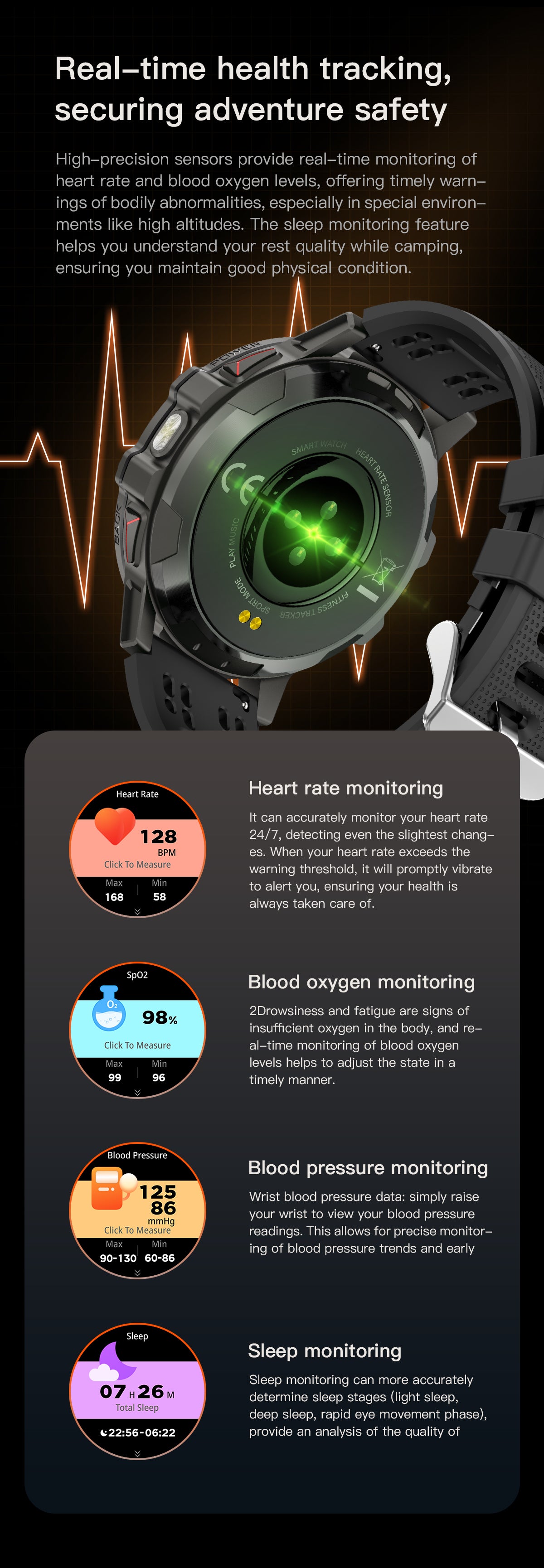 | Sensor | Wrist Heart Rate Monitor, Pulse Ox Blood Oxygen Saturation Monitor, Proximity sensor, Accelerometer |